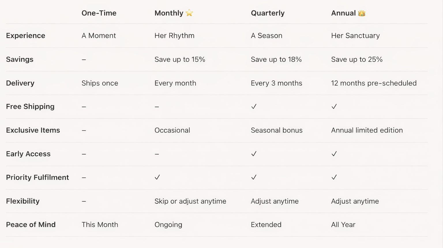 Three months of intentional comfort — seamlessly delivered. For women committing to consistency, or partners offering a meaningful gift beyond a single moment.